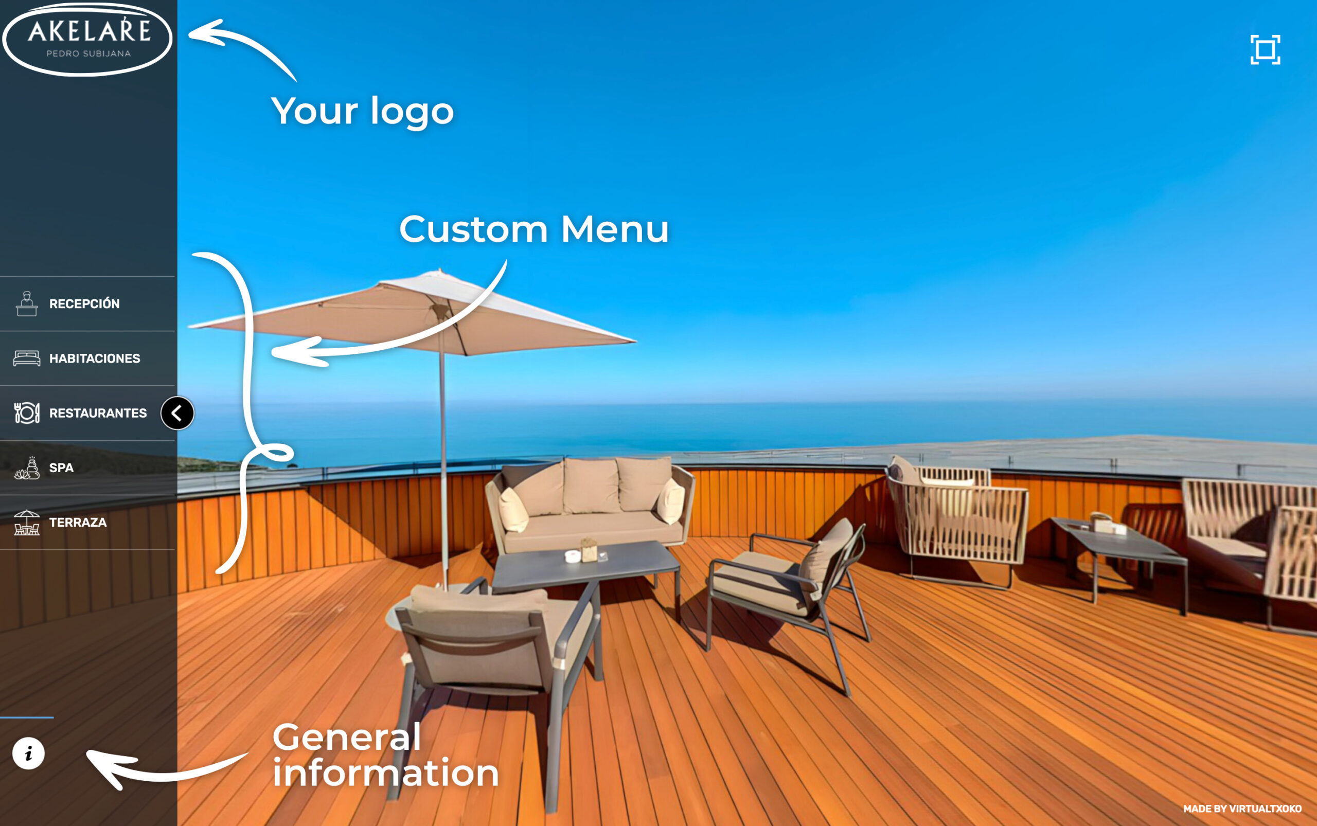 At Virtual Txoko, we design 360º virtual tours with customized menus to ensure smooth and engaging navigation. We adapt your brand’s colors, typography, and logos so that the tour reflects your business identity.